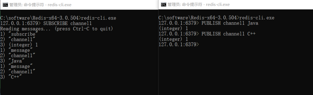 开启两个客户端,一个订阅了频道channel1,另一个通过PUBLISH发送消息后,订阅的那个就能收到了,靠这种模式就能实现不同客户端之间的通信。