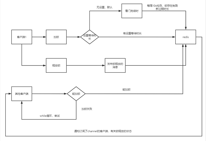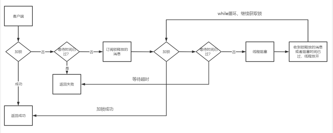 这里说明一下,之所以要循环,是因为锁可能会被多个客户端同时争抢,线程阻塞被释放之后的那一瞬间很可能还是拿不到锁,但是线程的等待时间又还没过,这个时候就需要重新跑循环去拿锁。