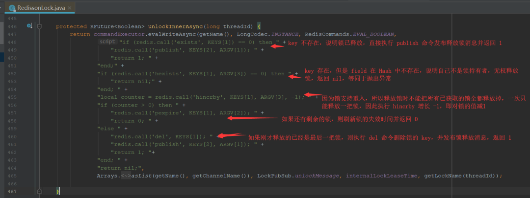 又是一大串的lua脚本,比起前面加锁那段脚本的命令稍微复杂了点,不过没关系,我们简单梳理一下,命令的逻辑大概是这么几步: