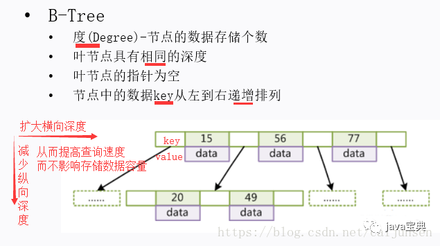 B+Tree通过把data不放在非叶子节点来增加度(小节点),一般会一百个以上使得深度是3~5,从而减少查询次数。并且,叶子节点之间会有指针,数据又是递增的,这使得我们范围查找可以通过指针连接查找,而不再从上面节点往下一个个找。结论:B+Tree 既减少查询次数又提供了很好的范围查询