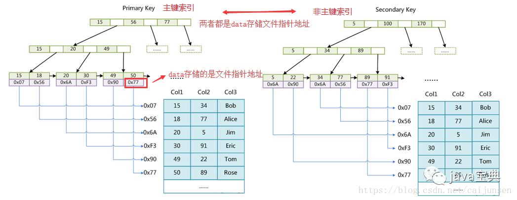 MyISAM索引文件和数据文件是分离的,文章一开始也介绍了,数据.MYD+结构.frm+索引.MYI三个文件 那MyISAM的索引是什么样的?