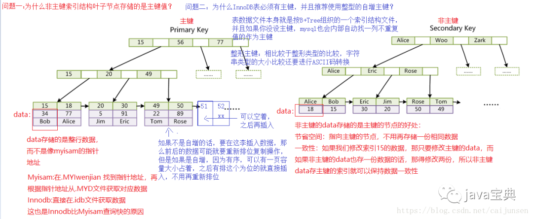 数据文件本身就是索引文件 表数据文件本身就是按B+Tree组织的一个索引结构文件 聚集索引-叶节点包含了完整的数据记录 为什么InnoDB表必须有主键,并且推荐使用整型的自增主键?为什么非主键索引结构叶子节点存储的是主键值?(一致性和节省存储空间)