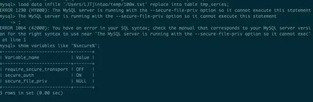 注意:导入数据时有可能会报错,原因是mysql默认没有开secure_file_priv( 这个参数用来限制数据导入和导出操作的效果,例如执行LOAD DATA、SELECT … INTO OUTFILE语句和LOAD_FILE()函数。这些操作需要用户具有FILE权限。)