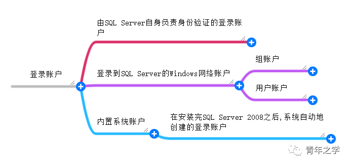 在SQLServer 2008中,有两类登录账户:由SQL Server自身负责身份验证的登录账户和登录到SQL Server的Windows网络账户 ,可以是组账户或用户账户。