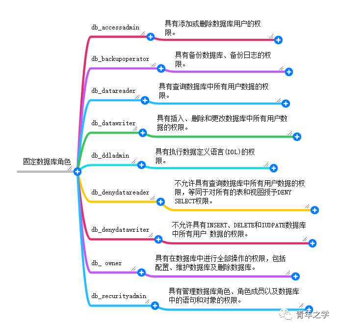 | db_denydatareader | 具有管理数据库角色、角色成员以及数据库中的语句和对象的权限。 |