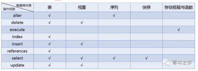 「对象特权」对象特权用于维护表级、行级与列级数据的安全性。下表列出了 数据库对象-----表、 视图、 序列、快照、存储过程与函数各对象上允许的操作权限(V表示操作允许)