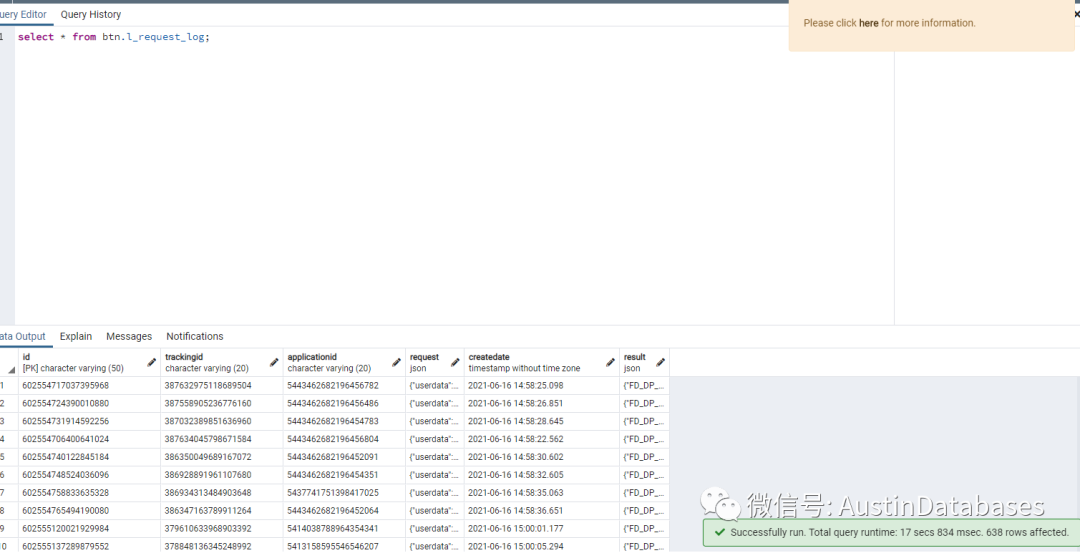 首先我们验证了一下,的确在PG_ADMIN查询平台上,查询很慢这张表的确要20多秒才能将1000行数据展出,但问题是他真的只有1000行。那么我们先看看到底是为什么。