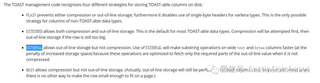 EXTERNAL这个方式和上的方式的区别就是压缩,这样的存储是不会对数据进行压缩处理的,直接而这样的方式对于text和bytea存储是可以相对于上的存储方式要快速的。