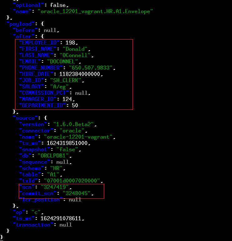 name=testoracledbconnector.class=io.debezium.connector.oracle.OracleConnectordb_type=oracletasks.max=1database.server.name=oracle-12201-vagrantdatabase.tablename.case.insensitive=truedatabase.oracle.version=12+database.hostname=192.168.56.130database.port=1521database.user=c##dbzuserdatabase.password=dbzdatabase.dbname=ORCLCDBdatabase.pdb.name=ORCLPDB1database.history.kafka.bootstrap.servers=localhost:9092database.history.kafka.topic=debezium.oracledatabase.history.skip.unparseable.ddl=trueinclude.schema.changes=truetable.whitelist=hr.a1errors.log.enable=true