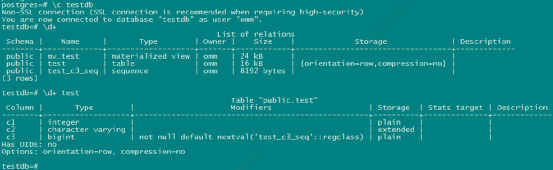 名为test的表、物化视图mv_test以及序列test_c3_seq都与源数据库相同,同时test_c3_seq序列也与字段绑定在一起。