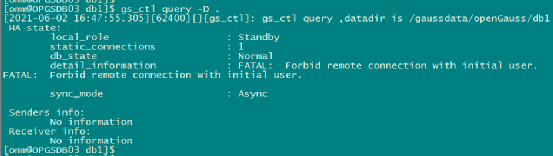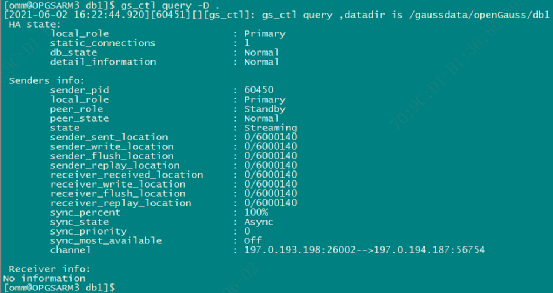 # 添加白名单gs_guc reload -N all -I all -h "host all all 0.0.0.0/0 sha256" &&gs_guc reload -N all -I all -h "host all all <本机ip>/32 trust" &&gs_guc reload -N all -I all -h "host all all <对机ip>/32 trust"# 修改guc参数,max_connections在两台服务器上一定要保证一致gs_guc reload -N all -I all -c "remote_read_mode=off" &&gs_guc reload -N all -I all -c "listen_addresses = '*'" &&gs_guc reload -N all -I all -c "max_connections = 800"#修改replconninfo1replconninfo1 = ‘localhost=<本机ip> localport=26002 localservice=26004 localheartbeatport=26005 localheartbeatport=26005 remotehost=<对机ip> remoteport=26002 remoteservice=26004 remoteheartbeatport=26005’# 重启数据库 一台机器以主的身份启动后,另一台以从启动。#主机gs_ctl restart -D . -M primary#备机gs_ctl restart -D . -M standby && gs_ctl build -D . -b full