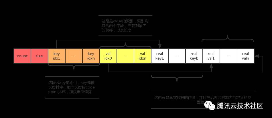 JSON对象的Key索引(图中橙色部分)都是排序好的,先按长度排序,长度相同的按照code point排序;Value索引(图中黄色部分)根据对应的Key的位置依次排列,最后面真实的数据存储(图中白色部分)也是如此