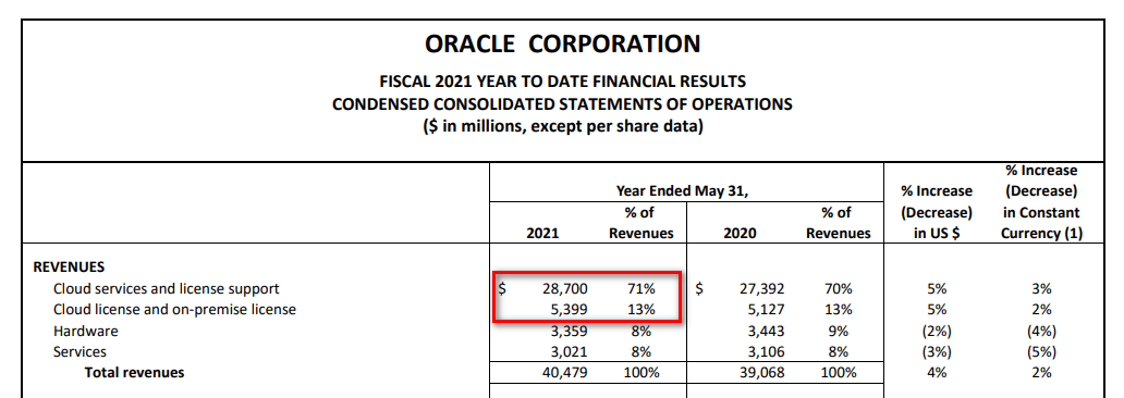 就各部门的业绩来说,云服务和授权支持业务依旧占据了甲骨文全年营收的大头。数据显示,甲骨文云服务和授权支持业务的营收为287.00亿美元,与去年相比增长了5%;在总营收中所占比例为71%,2020财年中所占比例为70%。