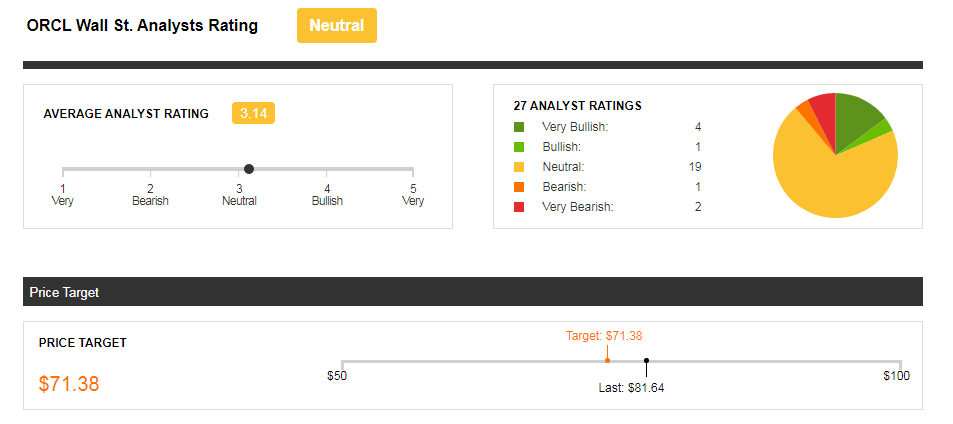 美股研究社认为,自2011年起,甲骨文的营收便再没有出现过明显的大幅增长,而Q4财季和2021财年的增长微超预期也不是新业务带来的影响。一个明显的信号是近期美国银行、巴克莱等机构纷纷下调了对甲骨文的评级,其目标股价只有70美元左右,低于目前的近80美元,相比微软、谷歌等业务竞争者也低上太多,主流分析师评级也以保守为主。