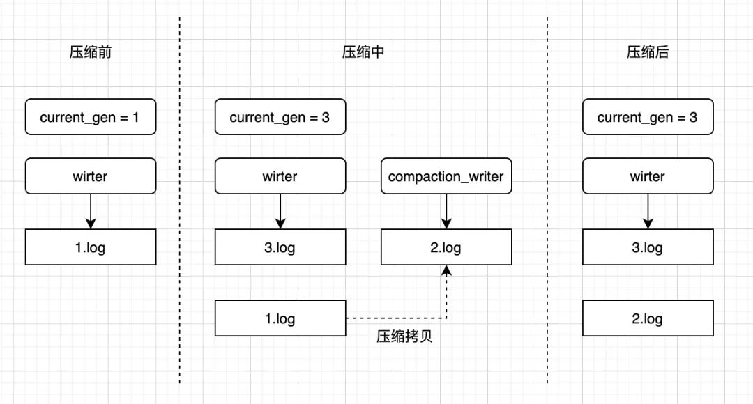 压缩过程中让当前写入切换到3.log,可以保证写入不受影响,同时新增一个2.log作为压缩日志进行拷贝,边拷贝边更新索引,可以保证读取不受影响,等压缩完成之后,把1.log删除,平滑切换到新的日志上面。