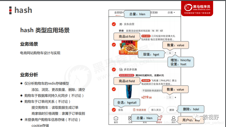 解决方案以客户id作为key,每位客户创建一个hash存储结构存储对应的购物车信息将商品编号作为field,购买数量作为value进行存储添加商品:追加全新的field与value浏览:遍历hash更改数量:自增/自减,设置value值删除商品:删除field清空:删除key此处仅讨论购物车中的模型设计购物车与数据库间持久化同步、购物车与订单间关系、未登录用户购物车信息存储不进行讨论127.0.0.1:6379> hmset 001 g01 100 g02 200OK127.0.0.1:6379> hmset 002 g02 1 g04 7 g05 100OK127.0.0.1:6379> hset 001 g03 5(integer) 1127.0.0.1:6379> hgetall 0011) "g01"2) "100"3) "g02"4) "200"5) "g03"6) "5"127.0.0.1:6379> hdel 001 g01(integer) 1127.0.0.1:6379> hgetall 0011) "g02"2) "200"3) "g03"4) "5"127.0.0.1:6379> hincrby 001 g03 1(integer) 6127.0.0.1:6379> hgetall 0011) "g02"2) "200"3) "g03"4) "6"