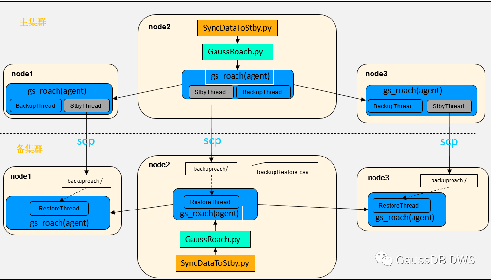 下图是接上图的部署架构,涉及双集群同步脚本(SyncDataToStby.py), 备份程序(GaussRoach.py, gs_roach)三个二进制文件