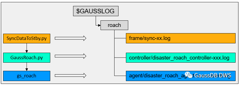 如上图,双集群的日志也是存放到$GAUSSLOG这个目录,并且有自己独立的目录 roach, 由这个目录同样是备份/恢复的对应的log路径。我们按调用关系从上到下的角度来介绍存放 SyncDataToStby.py 生成的log,涉及到双集群调度,备份集清理,状态显示,配置文件及命令行参数解析的功能。存放 GaussRoach.py 生成的log,涉及到备份、恢复准备工作一些操作,备份、恢复参数解析,备份集群的处理,错误处理等存放 gs_roach工具 生成的log,涉及到gs_roach 连接gaussdb/gtm/cm发起备份/恢复,生成备份集/恢复备份集等操作。gs_roach工具功能:在备份侧完成将cn/dn/gtm/cm的数据文件按顺序打包成备份文件的功能,并生成备份集元信息文件; 恢复侧根据元信息文件将备份集文件解压到对应cn/dn/gtm/cm的数据目录中。定位步骤