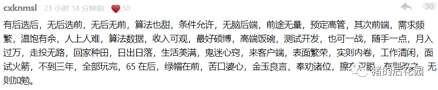 最后放一张好久之前看到的图吧,确实个人感觉后端相对好一点?不过哪里都内卷吧。要想不被内卷,还是要不断提高自己的技术以及软实力。活着挺难,但还是要好好活着!