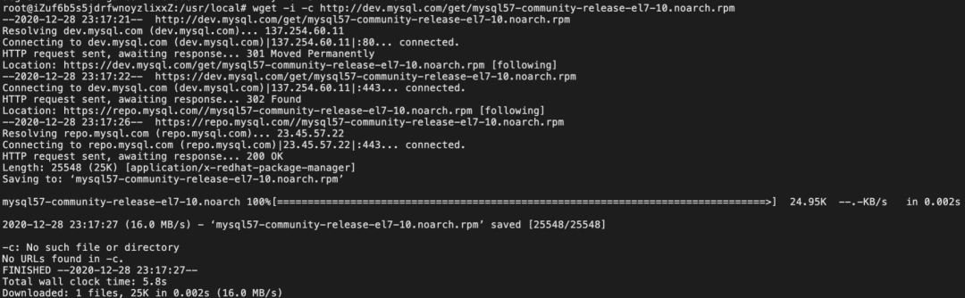 wget -i -c http://dev.mysql.com/get/mysql57-community-release-el7-10.noarch.rpm