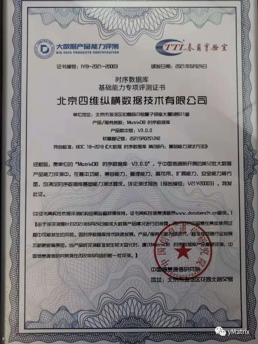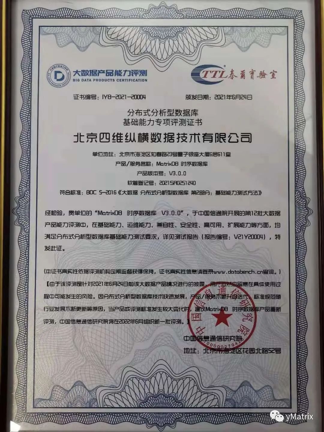 在6月24日举行的“2021大数据产业峰会”上,中国信息通信研究院(简称“中国信通院”)向通过数据库能力评测的大数据产品公开颁发了证书。其中,四维纵横公司自主研发的国产超融合时空数据库MatrixDB,同时通过了“分布式分析型数据库基础能力评测”和“时序数据库基础能力评测”,是唯一一款同时通过了两种基础能力评测的数据库产品,标志着超融合时空数据库时代的到来。
