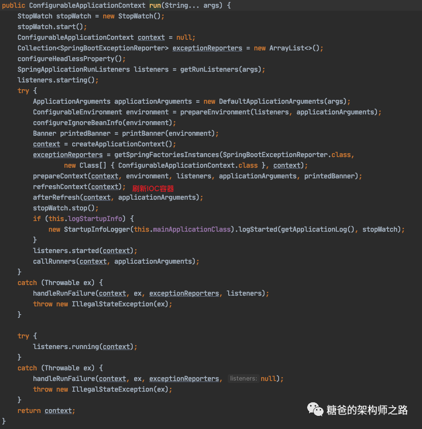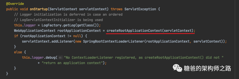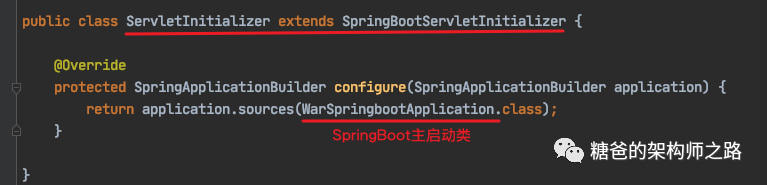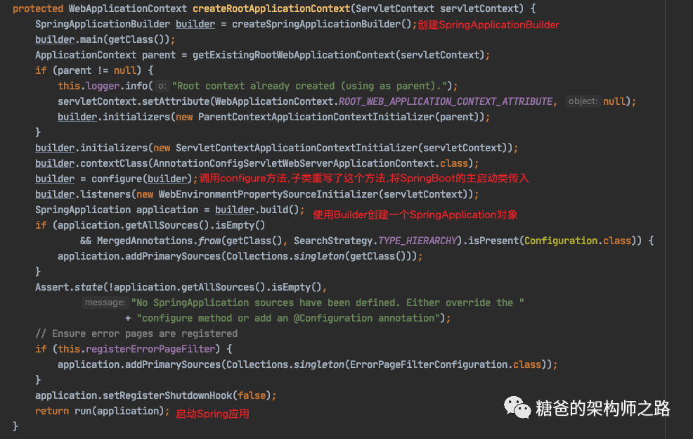这里最主要的目的还是为了创建并启动Spring应用,需要特别注意的是,这里会回调我们自定义并继承的configure()方法,从代码中看,重写configure的目的就是将我们的启动类提交到builder中。如下图:
