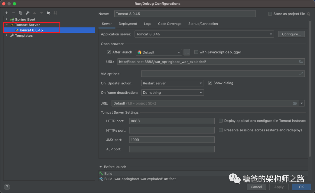 这样就完成啦,剩下的工作就是我们熟悉的配方了。通过Maven打成war包,安装Tomcat服务,将war包放在指定目录下,配置Tomcat相关属性,最后启动Tomcat就可以啦。如果你使用IDEA在本地启动,也只需要配置一下IDEA中的Tomcat配置指向本地的Tomcat安装路径,如下图: