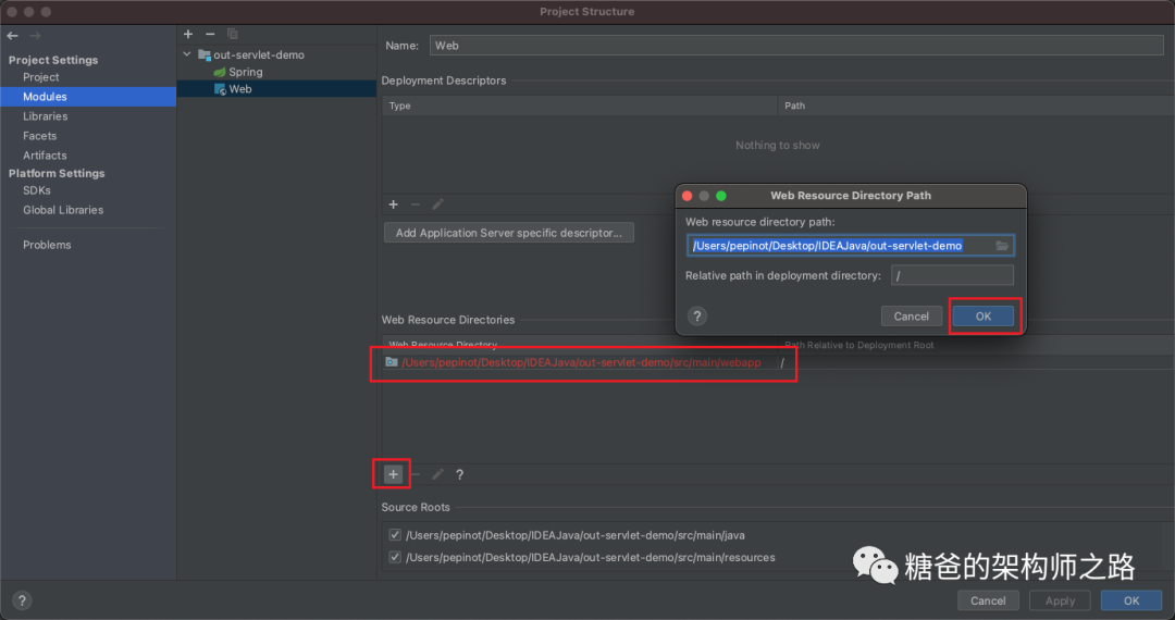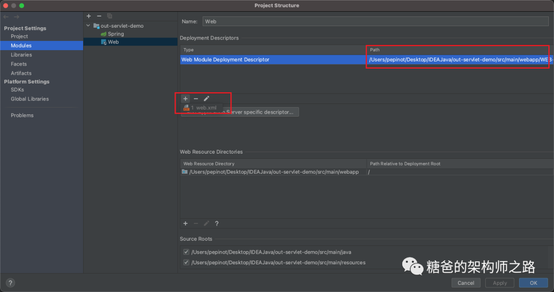 首选选择Product structure -> Modules -> web,这里就是构建web工程文件结构的地方,红色字那里证明我们现在还没有webapp文件,选择➕,设置好路径后点击OK,IDEA就会帮我们自动创建webapp文件夹。如下图: