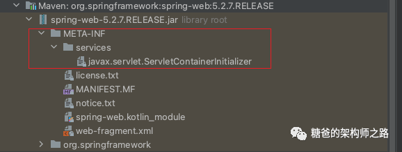 服务器启动(web应用启动)会创建当前web应用里面每一个jar包里面ServletContainerInitializer实例。 ServletContainerInitializer的实现放在jar包的META-INF/services文件夹下,有一个名为 javax.servlet.ServletContainerInitializer 的文件,内容就是ServletContainerInitializer的实现类的全类名 如果我们想使用某些类,可以在@HandlesTypes注解中标识