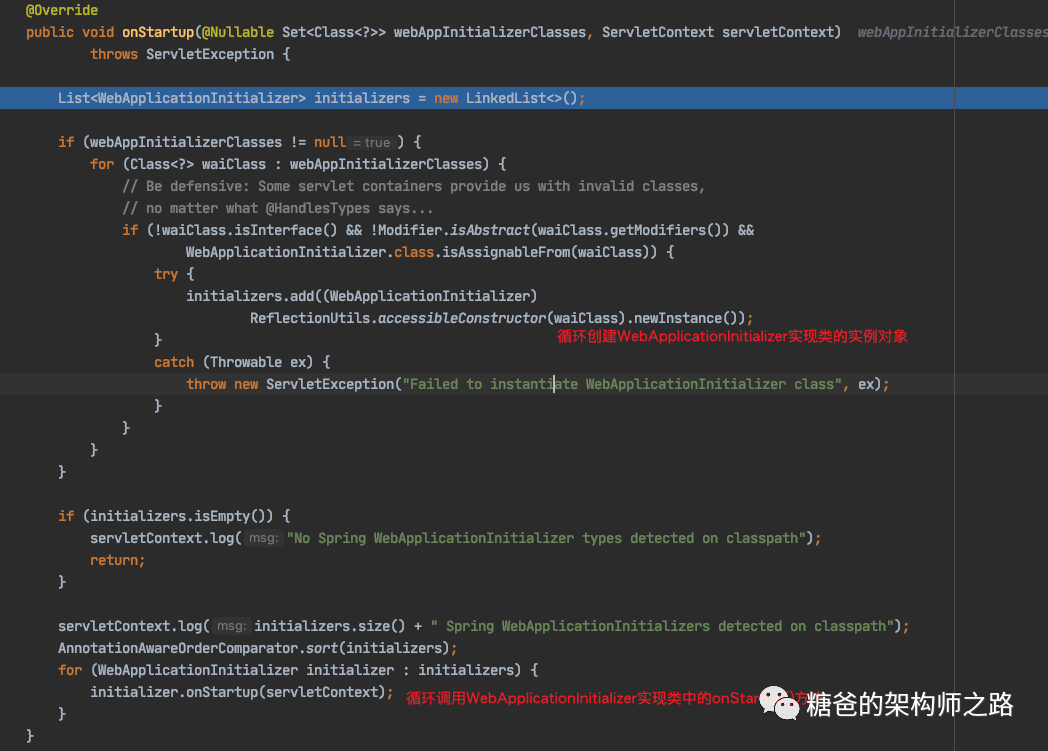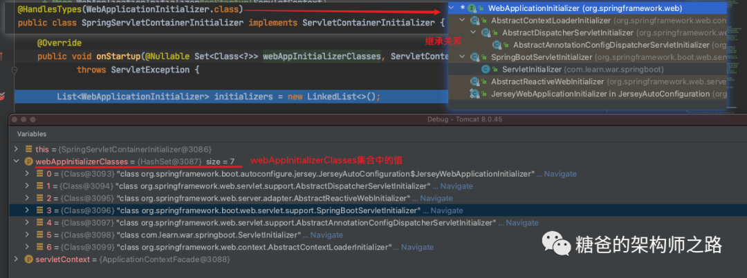 通过截图中的红框对比可以看出,当onStartup()方法被调用时,参数webAppInitializerClass集合中的元素正是@HandlersTypes注解中标识的WebApplicationInitializer接口的实现类。
