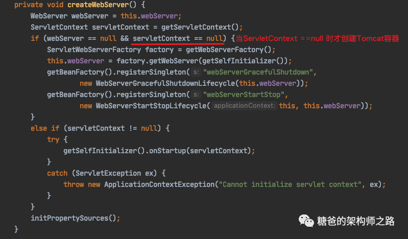 即便我们真的不小心引入了tomcat的包导致TomcatServletWebServerFactory加载到容器中,也不会出现问题。因为在CreateWebServer()方法中,只有当this.servletContext == null时才会执行getWebServer方法。