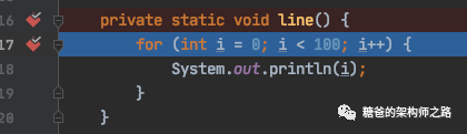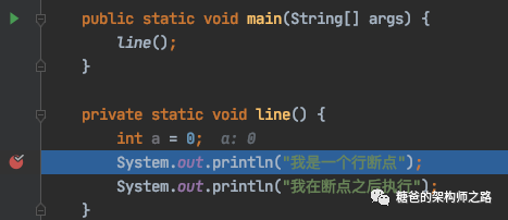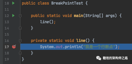 行断点是我们开发中用的最多的一种断点。它应用于方法体内部的某一行代码。只需要在需要断点的那行代码左边点击鼠标左键,就会看到一个红色的小圆点,这时我们以debug模式启动,如果该方法被调用,那么当执行到断点的那行代码时就会停住供我们进行调试和修改工作。如下图: