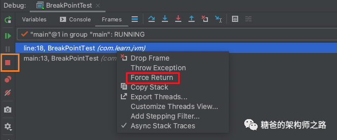 Drop frame:这个功能比较有意思,丢弃当前栈帧。会直接返回到方法调用者调用方法的那行代码,如果继续执行,断点会再次进入被调用的方法。这个功能要和force return区分开,想象一下,如果打了一个行断点,当代码运行到断点位置时,我们经过调试发现这行代码需要修改,这时肯定要将应用停下来,后面的代码就不需要执行了。要做到这点,通常情况下我们会直接点停止按钮,但是这里即便我们点了停止按钮,在当前方法内部,断点后面的代码也依然会执行。在网上很多的文章中都提到Drop Frame就是帮助我们避免这种问题的,它会将当前栈帧从断点处直接销毁,后面的代码就不会执行了。