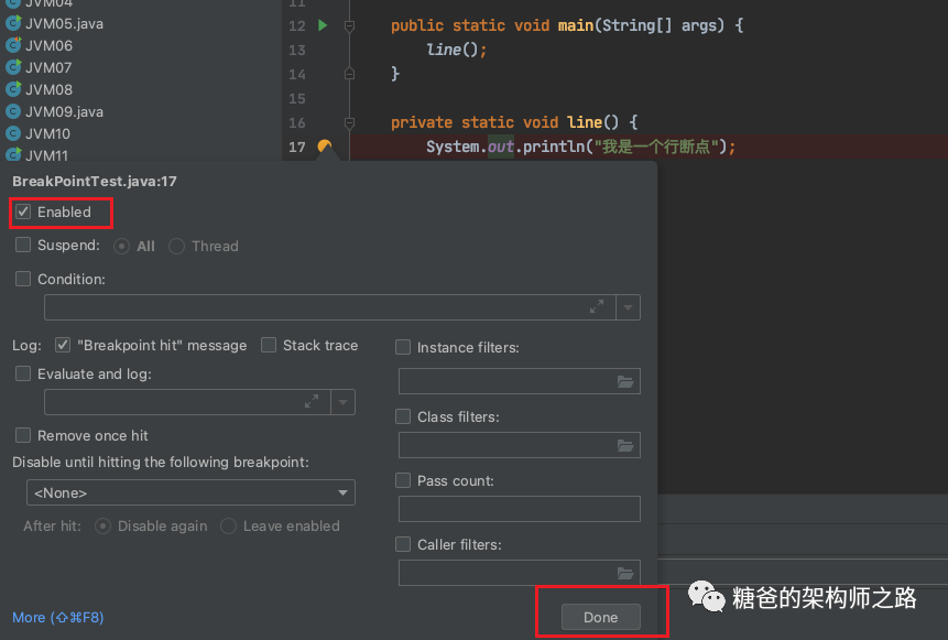 那源断点有什么作用呢?试想一下,如果我们在打了过多的行断点后,为了不影响程序运行,需要暂时取消掉一些行断点,但是又不想彻底取消,因为后面还有可能再次开启。这种情况下就可以将行断点改为源断点,只需要在刚才的面板中将Suspend取消选中即可。当想再次启用时,根据打印的断点信息找到源断点,再次将Suspend选中并选择All,完成后源断点就又变回行断点了。