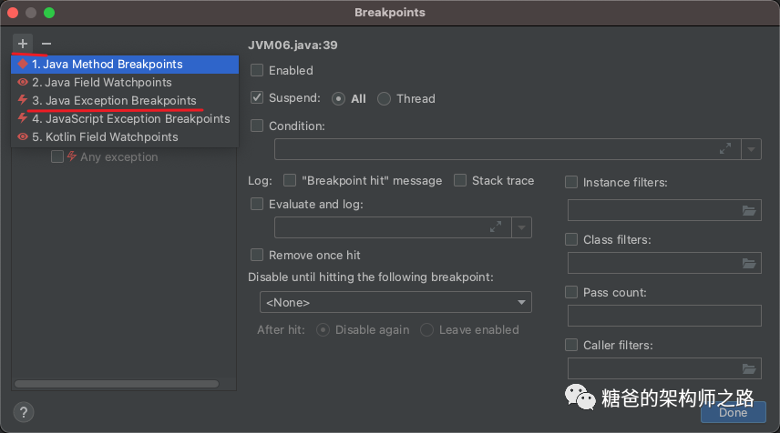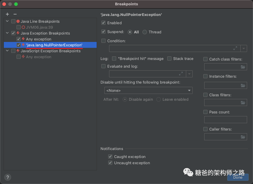 异常断点主要使用在当程序出现异常时,IDEA可以帮助我们通过断点的方式快速跳转到出现异常的那一行代码,并且可以根据异常的类型进行全局设置。设置方法如下图: