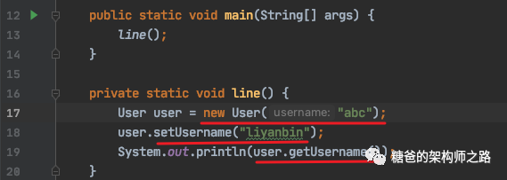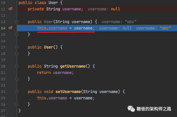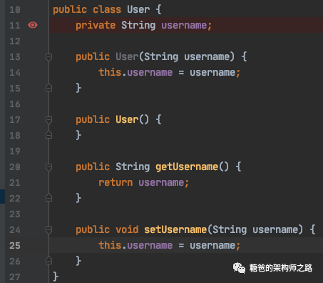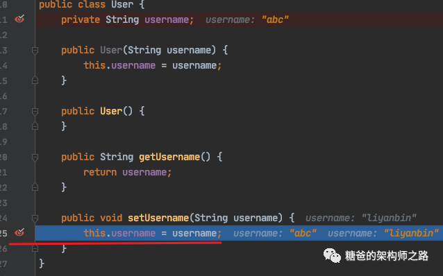 User类中有username属性,并且提供了访问器方法,在username中加入了字段断点。