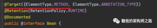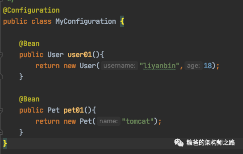 这其中就包括了@Configuration、通常配合@Configuration一起出现的还有@Bean,这里需要注意的是: