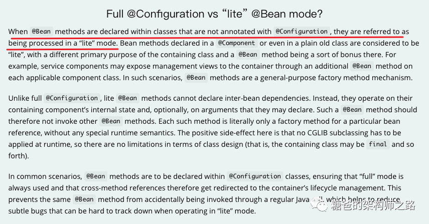 这里简单的总结一下,官方定义在没有标注@Configuration的类里面有@Bean方法就称为Lite模式的配置。不过这里需要注意,通过源码再看这个定义是不完全正确的,而应该是有如下情况均认为是Lite模式的配置类: