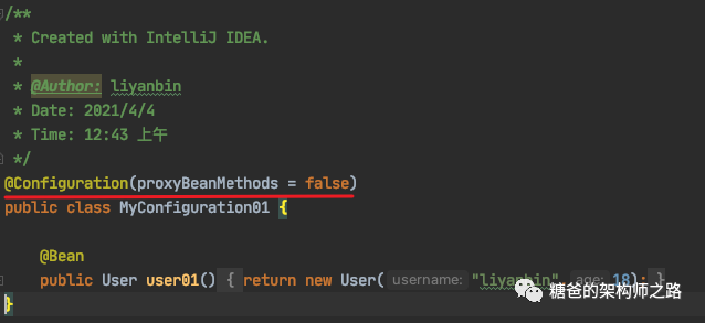 MyConfiguration01并没有被CGLib增强,也就是说,它并不是一个代理对象 通过MyConfiguration01#user01()获取的对象user02,并不是Ioc容器中的对象 @Bean可以在普通类中使用,但是该类必须是Ioc容器中的对象,并且标注的方法可以是private、final