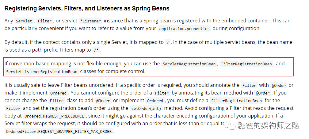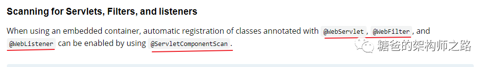 由于SpringBoot默认是以jar包的方式启动,不存在web.xml文件,所以按照之前传统Spring项目配置原生组件的方式是行不通的。这里我们可以参考官方文档,Spring官方给我们提供了两种注册的方式:
