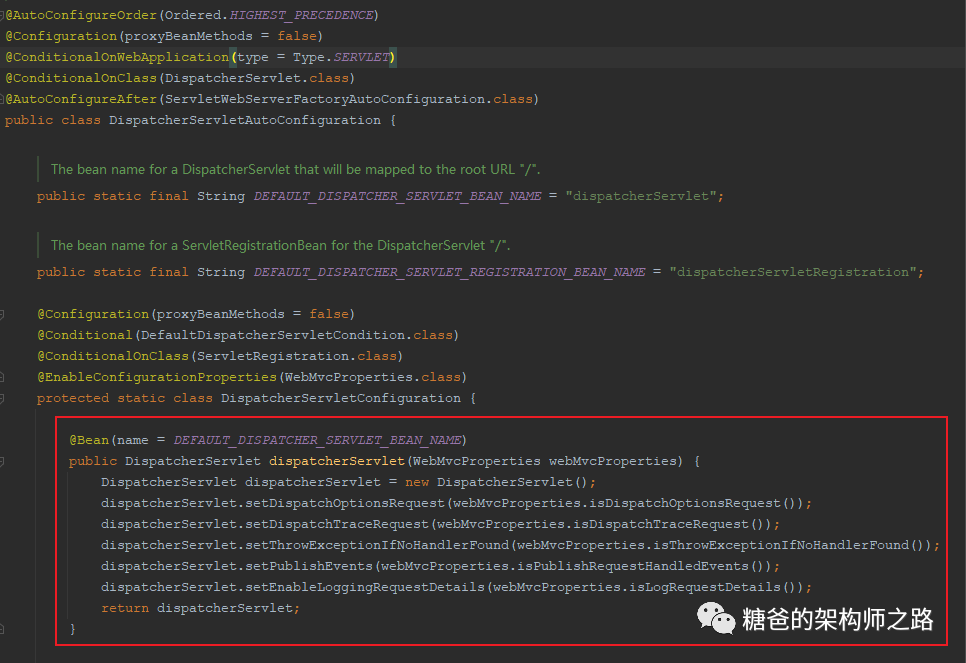 SpringWebMVC的集中访问点,而且负责职责的分派,并与Spring Ioc容器无缝集成,从而可以获得Spring的优势。在传统的Spring项目中,DispatchServlet也是需要配置在web.xml文件中的,但在SpringBoot中,我们依然也不需要做额外的配置,那DispatchServlet是如何加载到容器中作为Servlet使用的呢?这里就应用到了上一章节中提到的ServletRegistrationBean。