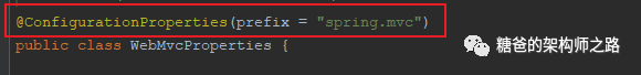 @ConfigurationProperties,说明我们可以在对应的application.properties中通过spring.mvc.xx配置SpringMVC的相关属性