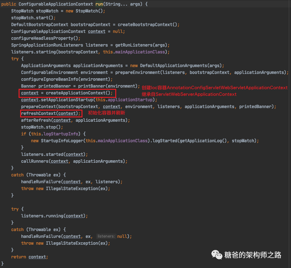 SpringApplication.run(String..args),在方法内部其实做了很多的事情,其中包括注册监听器、创建引导上下文环境、初始化容器等,这里我们只关心和本文相关的,也就是初始化Ioc容器,代码如下: