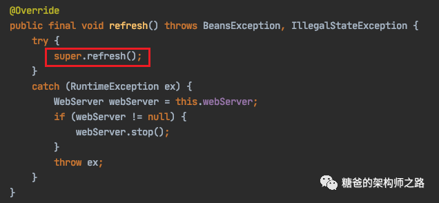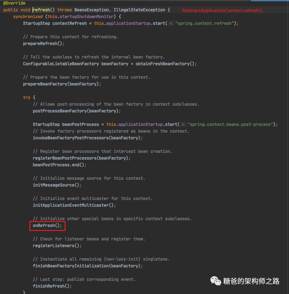 容器创建完成后,接下来SpringBoot会调用refreshContext()方法将刚创建的容器进行初始化和刷新操作,具体代码如下: