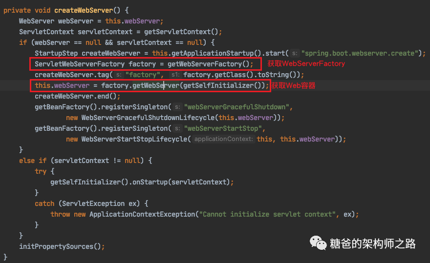 ServletWebServerApplicationContext作为嵌入式的Servlet容器的Ioc容器可以在启动时去找单例的ServletWebFactory,并且
