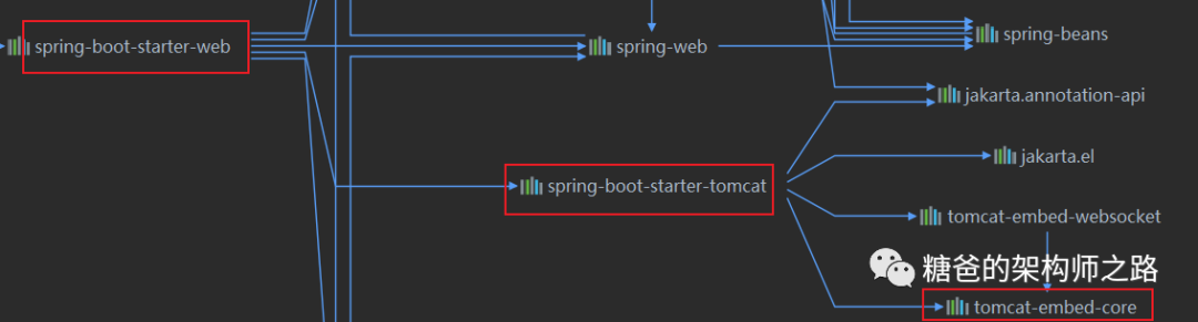 例如,spring-boot-start-web中默认就使用了Tomcat作为嵌入式Servlet容器,所以Maven中默认导入了Tomcat相关的jar包,如下图