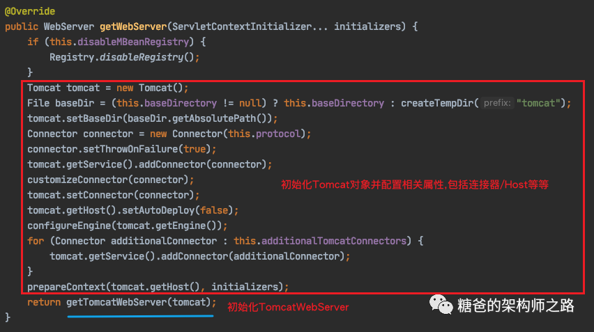 TomcatServletWebServerFactory,我们就来看下它里面实现的getWebServer()方法