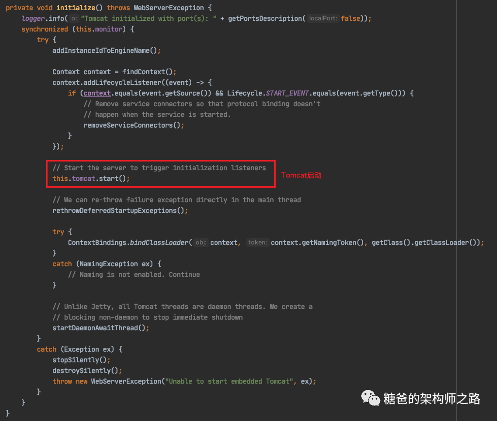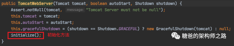 调用构造方法创建TomcatWebServer对象,默认端口8080,并初始化。