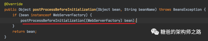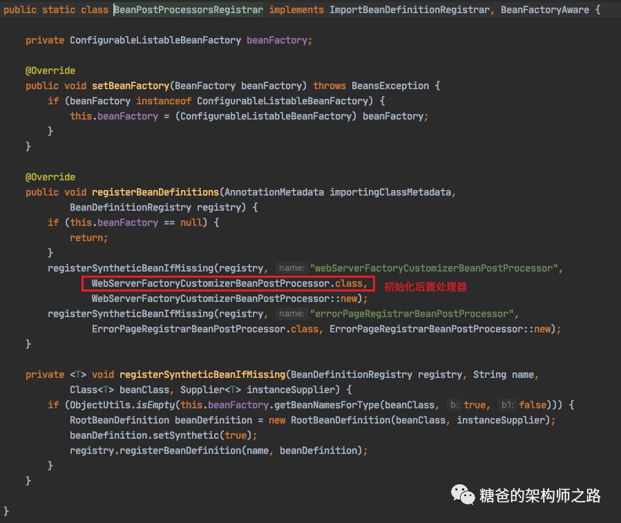 ServletWebServerFactoryAutoConfiguration.BeanPostProcessorsRegistrar,具体实现如下: