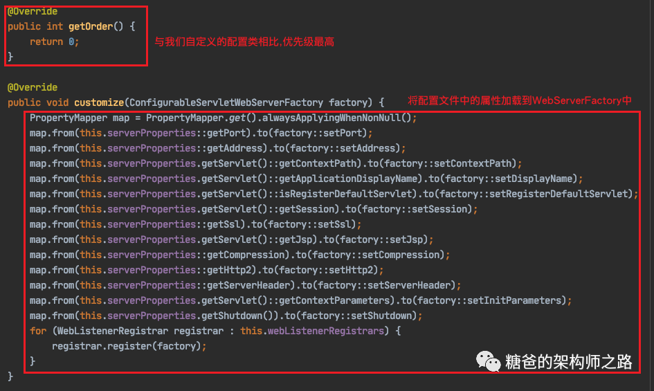 这个类做了两件事情,首先是将自己的优先级设置为最高,所以会优先于我们自定义的配置类加载,其次是将配置文件中的属性一次赋值给对应的WebServerFactory,具体代码如下: